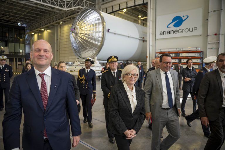 Catherine Vautrin, après la visite du hall d’intégration de l’étage principal d’Ariane 6, a souligné la dualité des activités civiles et militaires qui est au cœur d’ArianeGroup et qui répond à l’évolution de la situation géostratégique : « Aujourd’hui, le champ de bataille va des fonds marins jusqu’à l’espace». Le modèle dual d’ArianeGroup « permet de faire ruisseler des investissements et des savoir-faire vers de nouveaux programmes technologiques, industriels ».