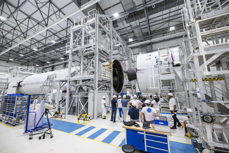 Actuellement dans le Bâtiment d’Assemblage Lanceur (BAL), l’étage principal et l’étage supérieur sont en cours d’assemblage mécanique et électrique pour former le corps central du lanceur. Ce dernier sera ensuite transféré sur le pas de tir et hissé en position verticale sur la table de lancement grâce au portique mobile.