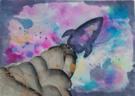 Die 13-jährige Leïla würdigt mit ihrer Rakete auf dem Weg zur Eroberung neuer Galaxien die umfassenden Arbeiten zur Berechnung von Flug- und Umlaufbahnen.