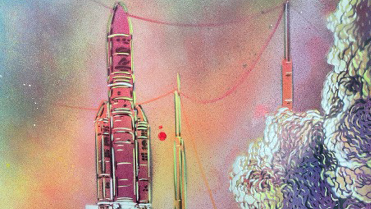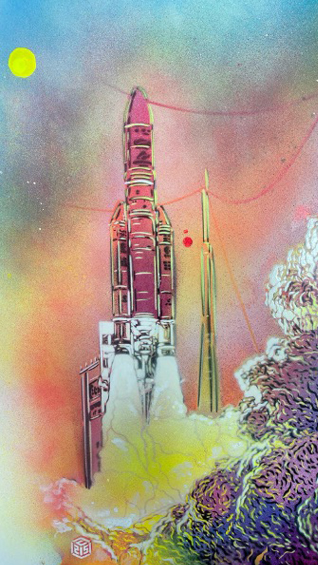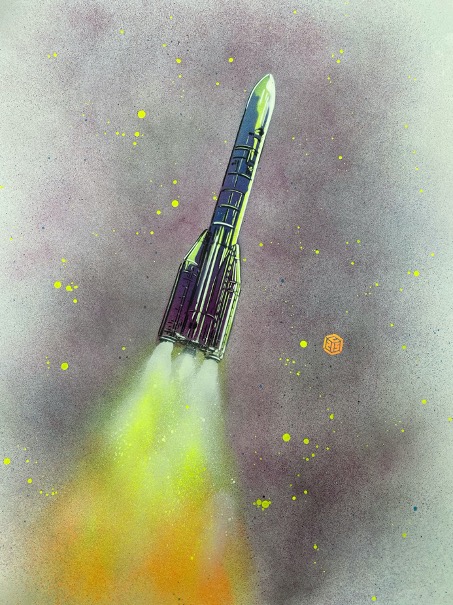 Meine einzigen Werkzeuge hier waren Schablone und Spraydose. Im ersten stark von der Volkskultur geprägten Bild fliegt die Ariane 6 durchs All. Meinen Stil wollte ich hier an jenen französischer Comics anlehnen. Die Abbildung des Starts der Ariane 5 entstand hingegen unter dem Motto maximale Abstraktion. Dabei stand nicht die Rakete selbst im Mittelpunkt, sondern die Inszenierung ihres Antriebssystems.