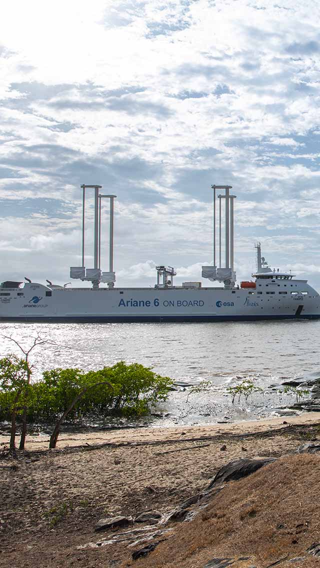 Canopée has been custom-built to meet the complex requirements of Ariane 6 transport. It is a hybrid-propulsion vessel designed to ship all the launcher stages and sub-assemblies together, to be environmentally friendly, and to halve shipping costs, particularly by the use of wingsails.